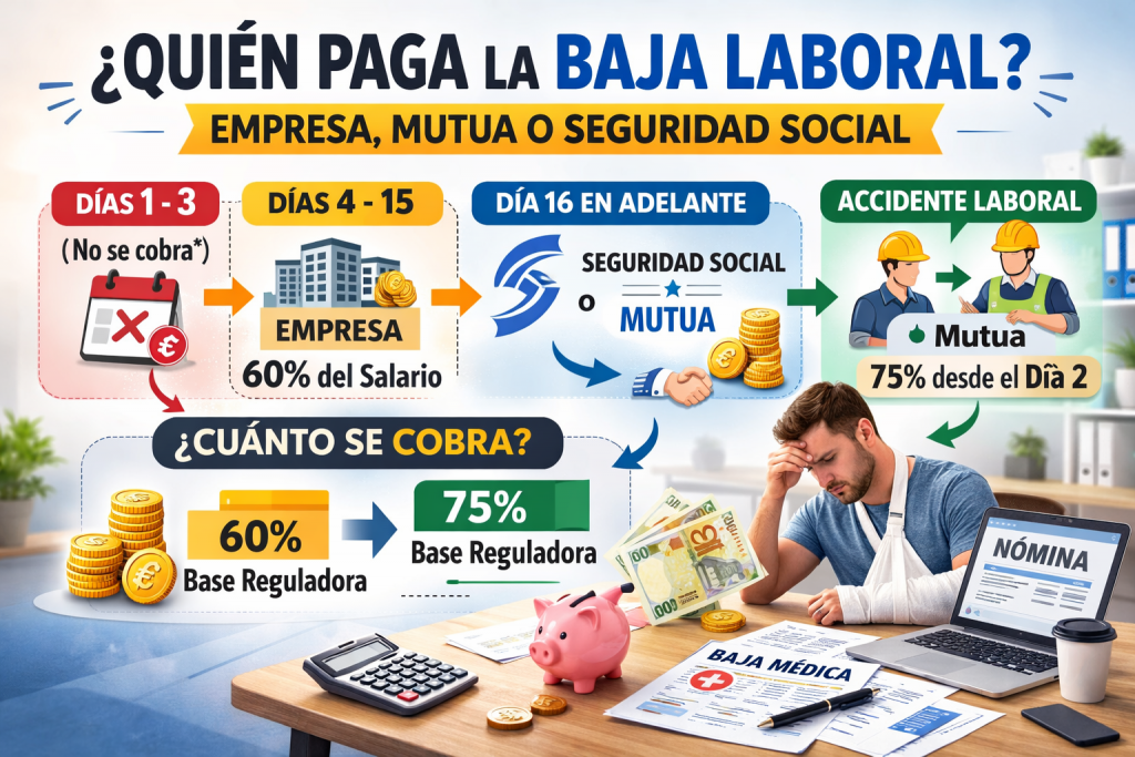 Cuando un trabajador está de baja médica, una de las dudas más habituales es quién paga realmente la baja laboral. Dependiendo del motivo de la baja y de los días que pasen, el pago puede corresponder a la empresa, la mutua o la Seguridad Social.